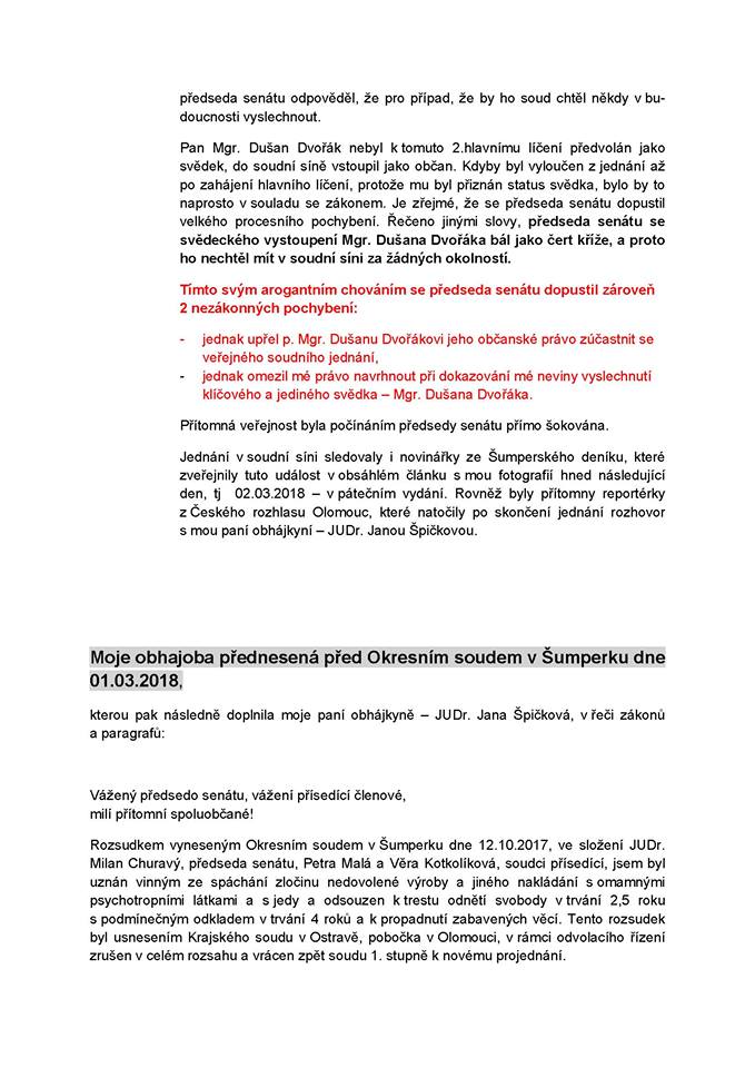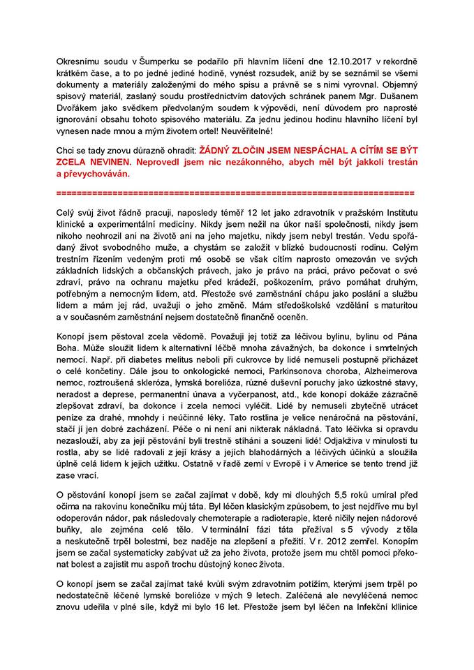 $l10n musí být pole. Chcete-li skriptům předat libovolná data, použijte místo toho funkci wp_add_inline_script(). Další informace o testování programu a hledání chyb naleznete v manuálu na stránce Ladění ve WordPressu (anglicky). (Tato zpráva se nově zobrazuje od verze 5.7.0.) in /data/web/virtuals/151169/virtual/www/domains/cannabiswarisover.com/wp-includes/functions.php on line 5313Ve čtvrtek 1. března 2018 v ranních hodinách proběhlo u Okresního soudu v Šumperku opravné řízení s obviněným členem výzkumu Konopí je lék Markem Rybářem. V odvolacím řízení 9. ledna u Krajského soudu v Ostravě (pobočka Olomouc) senát vrátil celý případ soudu nižší instance k novému projednání pro hrubé procesní nedostatky. Pan samosoudce JUDr. Milan Churavý se však se svými pochybeními opět nikterak nevyrovnal a Marka Rybáře i napodruhé odsoudil k trestu odnětí svobody v trvání 2,5 roku, s podmíněným odkladem na 4 léta. Sejdeme se tedy znovu u odvolacího soudu, o termínu přelíčení vás budeme včas informovat.